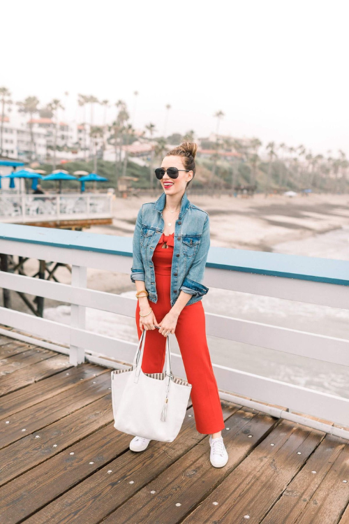 A colorful jumpsuit layered with a denim jacket is a one-and-done option. It’s trendy, comfortable, and subtly nods to classic American style.