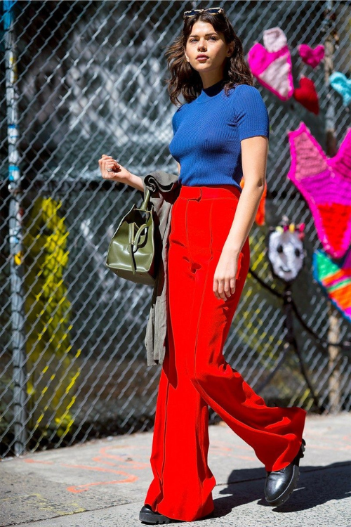 Pairing a blue top with red pants creates a strong, colorful statement. It’s vibrant and confident without needing extra details.