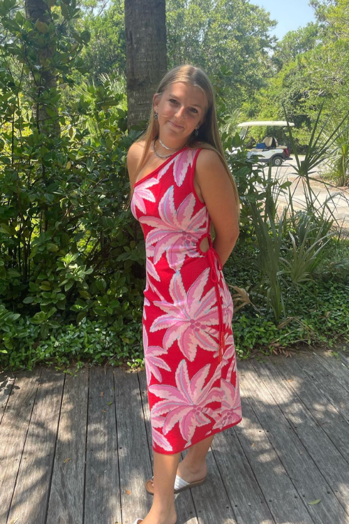 A red floral midi dress transitions easily from daytime picnics to evening fireworks. It feels classic and flattering.