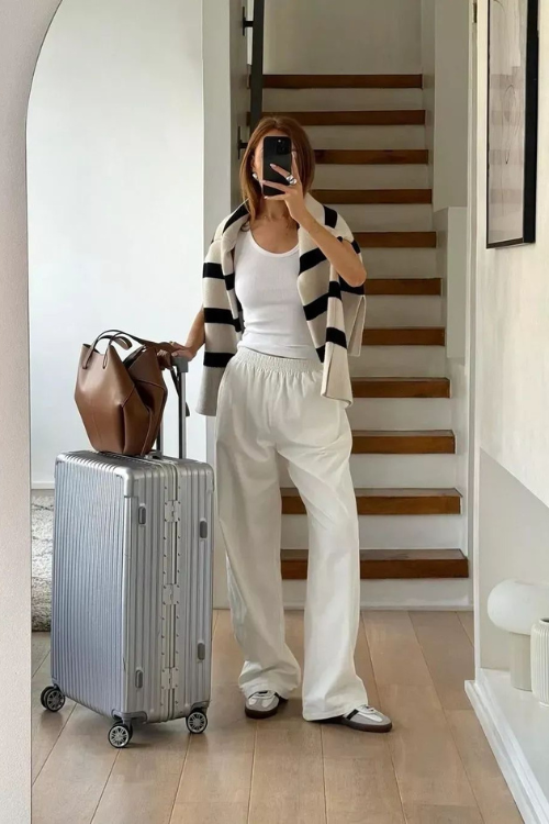 A tucked-in tank paired with breezy trousers looks effortless and keeps you cozy during boarding.