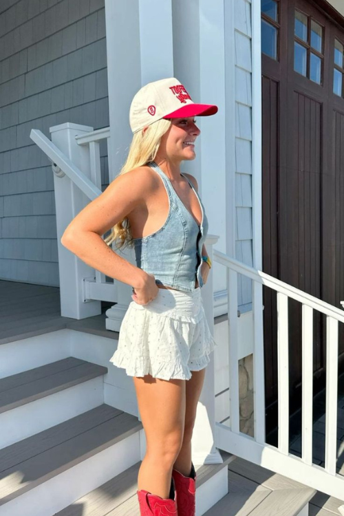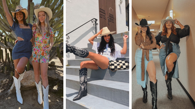 This final look uses a fitted top with denim shorts and cowboy boots, offering a timeless and reliable country concert outfit.