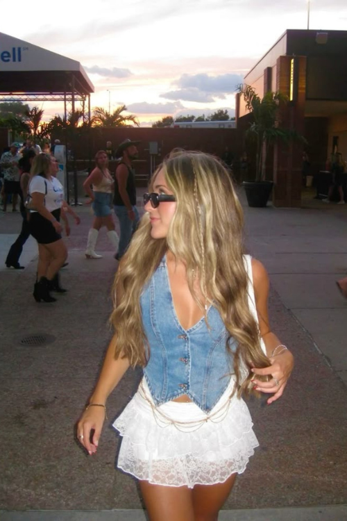 A white strappy or tube top paired with a denim mini skirt creates a clean, summery outfit that fits well with the country concert atmosphere.