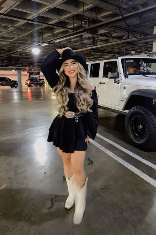 A black mini dress styled with cowboy boots and a hat offers a sleek, easy option that works well for country concerts.