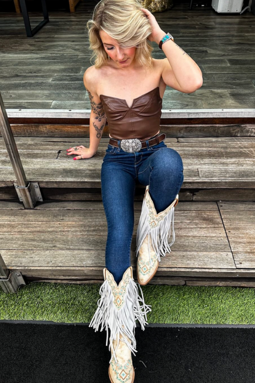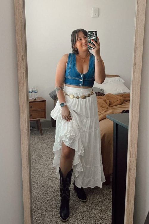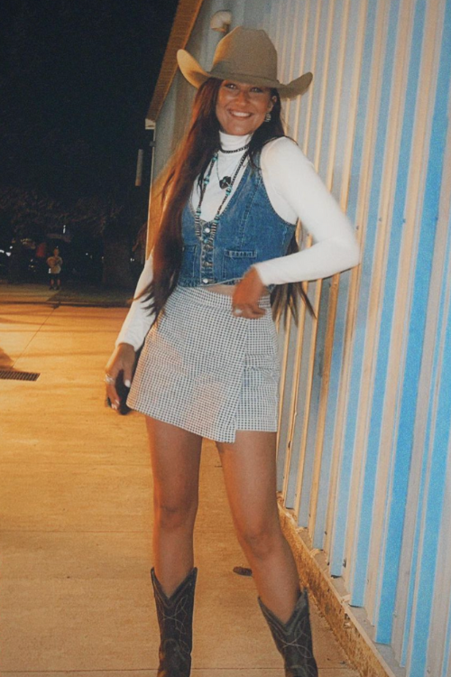 This outfit keeps things minimal with a fitted top and mini skirt, finished with cowboy boots to maintain the country feel.