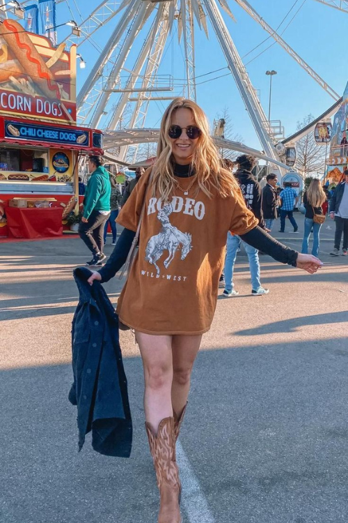 This outfit idea focuses on oversized tees or casual tops with denim shorts, paired with cowboy boots and hats for an effortless country look.