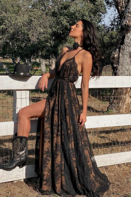 A maxi dress with a slit paired with cowboy boots offers comfort and freedom, making it ideal for outdoor concerts.