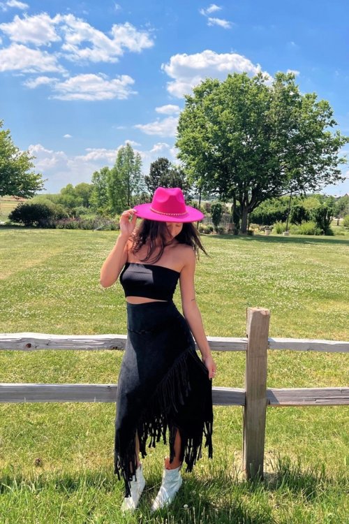 A tube top paired with a fringe-style midi skirt and a hat creates a balanced country-chic outfit.