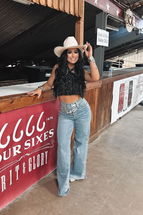 A fitted or halter-style top paired with wide-leg jeans offers a flattering and stylish country-inspired look.