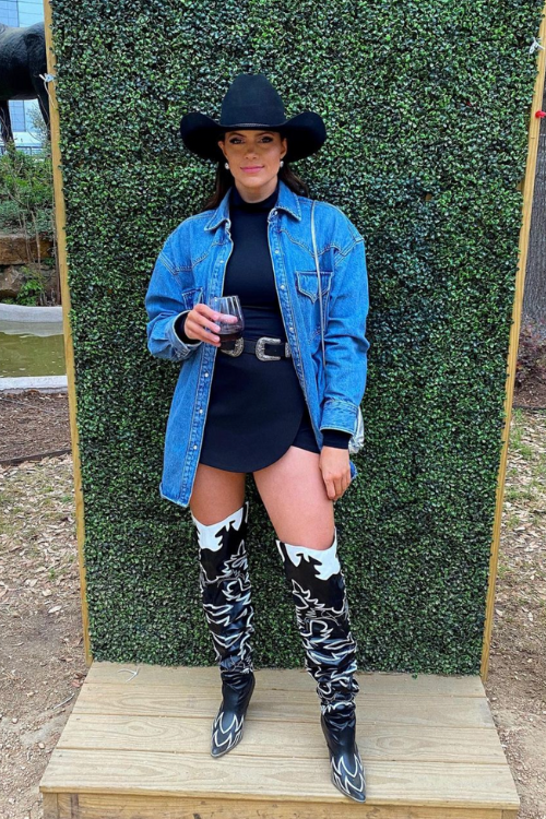 A fitted mini dress paired with boots and a hat creates a bold outfit that stands out at a country concert.