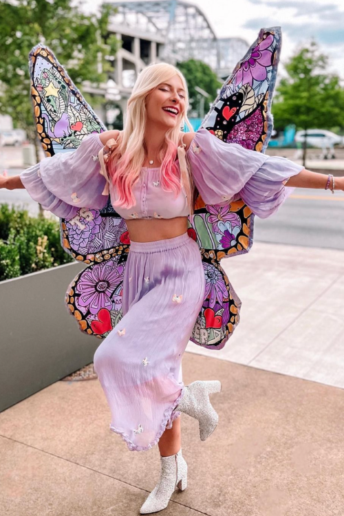A soft pastel outfit with butterfly details captures a sweet early-2000s pop aesthetic.