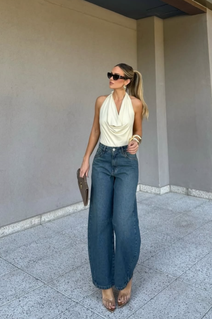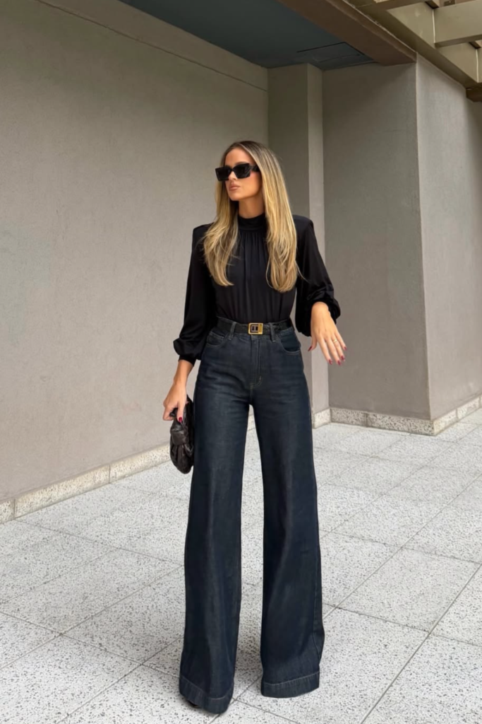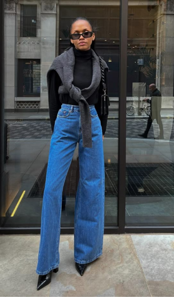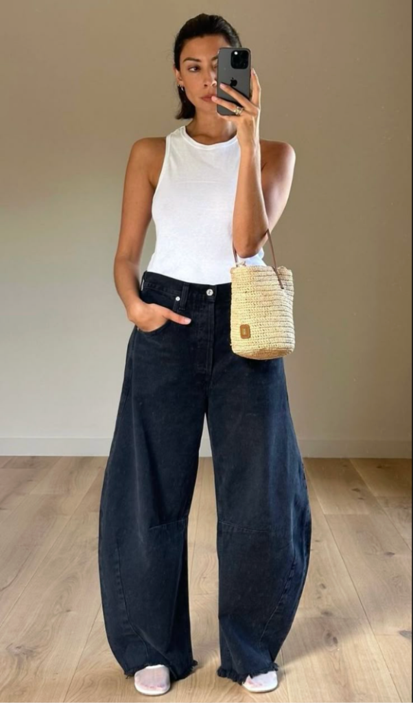 Barrel-leg jeans continue trending, especially in deeper washes like indigo or black. Their curved leg shape and tapered ankle create a sculpted look that feels modern yet refined. Simple tops allow the unique cut to stand out. Slightly cropped or tucked-in styling highlights the silhouette.