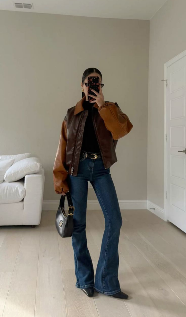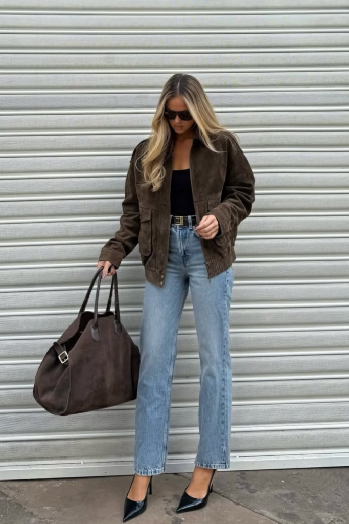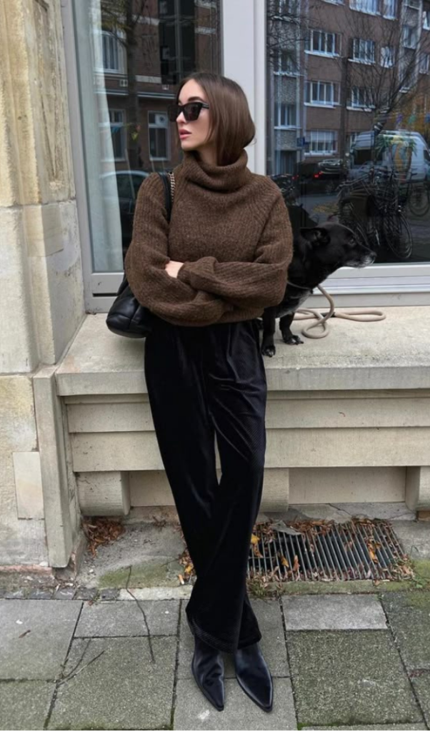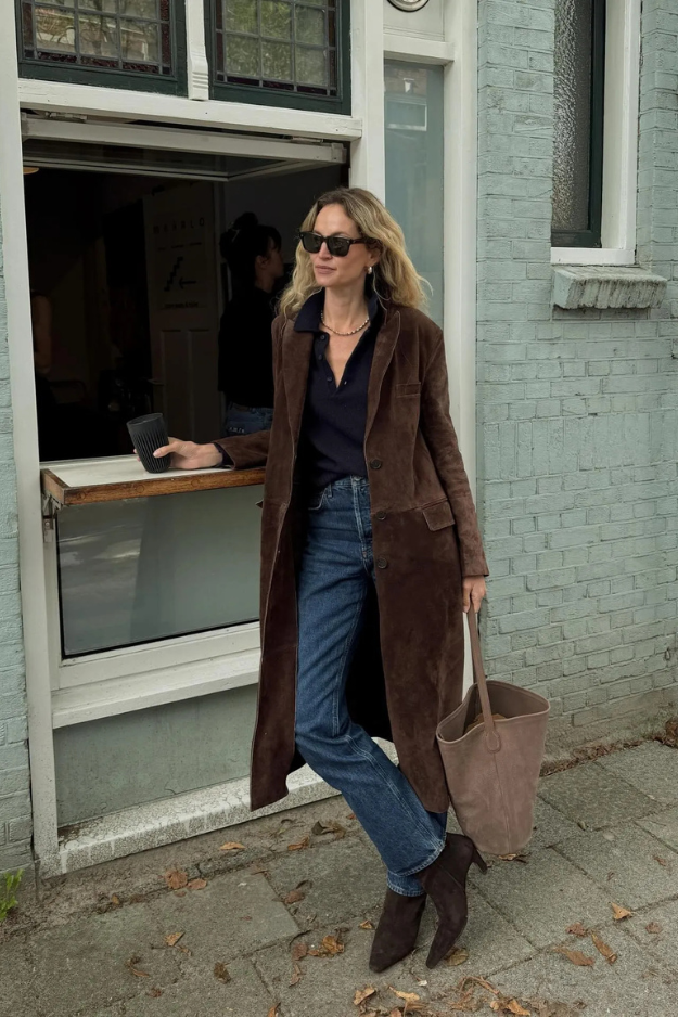 Denim with soft textures like velvet, corduroy, or suede adds subtle depth and richness. These fabrics appear mostly in deep, moody shades that transition easily from day to evening. Since the texture stands out on its own, the rest of the outfit should stay simple. Matte pieces work best to avoid clashing finishes.