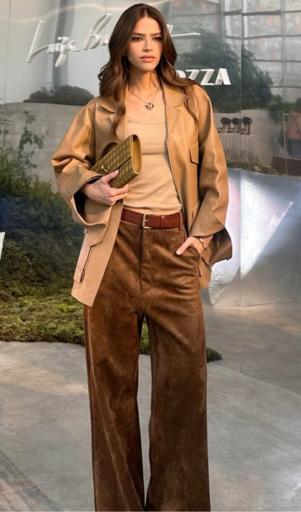 Alongside classic blue, softer tones such as cream, sage, muted grey, and dusty pink are gaining attention. These shades feel calm and refined while still acting like neutrals. They instantly make outfits look more considered and pair effortlessly with light or tonal layers. Styling them like traditional neutrals keeps the look balanced.
