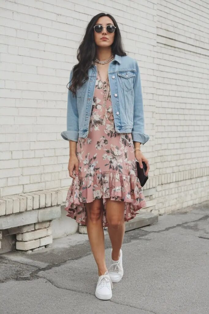 A denim jacket over a floral dress creates a nice mix of casual and soft styles. I like how sneakers keep the outfit grounded and practical. It’s an easy go-to for everyday summer outfit ideas.