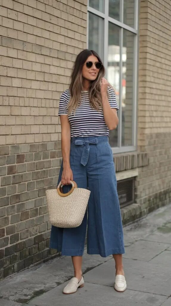 These striped wide-leg pants create a strong base for a balanced look when paired with a fitted crop top. I find the contrast between loose and fitted pieces really flattering. Adding simple accessories gives it a polished but relaxed vibe.