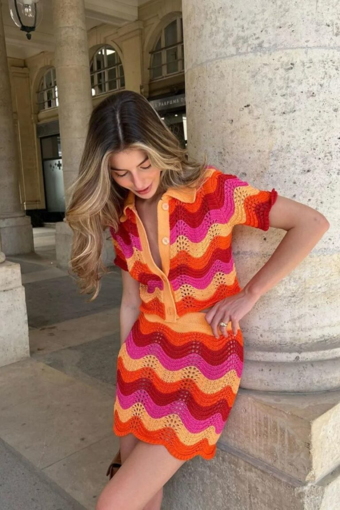 This colorful crochet dress brings a lot of personality with its bold shades and texture. I like keeping everything else minimal so the dress remains the main focus. It works well for both daytime plans and relaxed evenings.