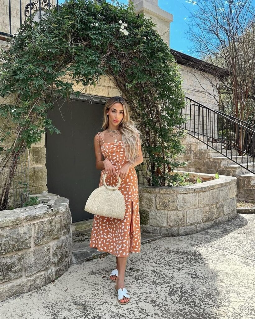 This polka dot midi dress feels light and easy, especially with its airy shape and subtle movement. I can style it with simple accessories to keep the focus on the print. It’s one of those looks that feels complete without trying too hard.