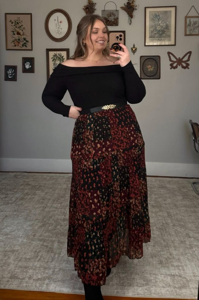 A simple black top with a floral skirt creates a mix of minimal and detailed pieces. I like adding tights and a belt to keep everything structured while still feeling soft and wearable.