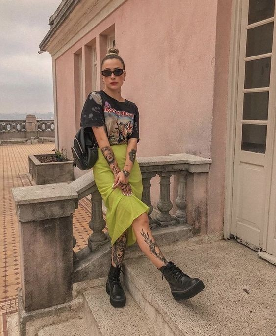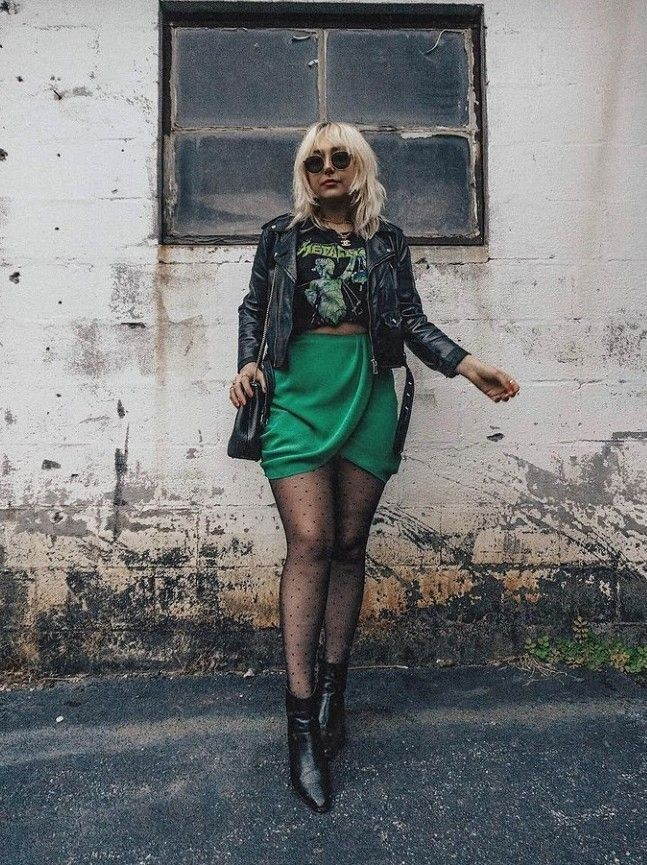 A graphic tee with a bold skirt creates instant contrast that stands out. Adding a jacket and boots helps ground the outfit, making it feel balanced and easy to wear.