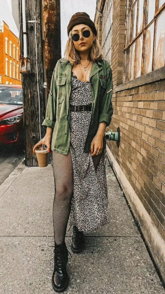 Layering an oversized jacket over a leopard slip dress creates a nice contrast between fitted and relaxed pieces. Adding tights and boots gives it that edgy feel while keeping it practical.