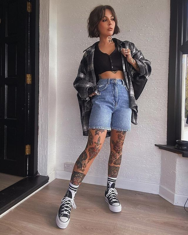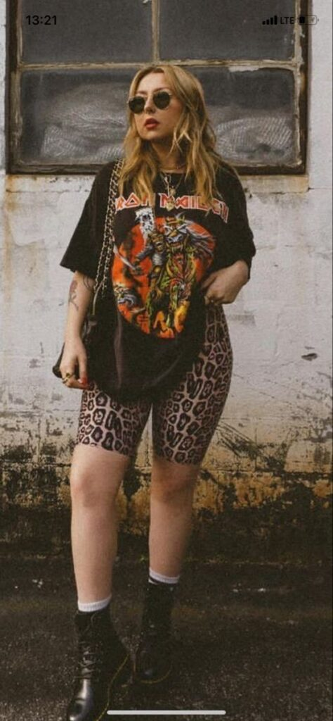 A cropped band tee with ripped shorts and a plaid shirt tied at the waist gives that classic grunge vibe I always come back to. Boots and sunglasses finish the look, making it feel casual but full of attitude.