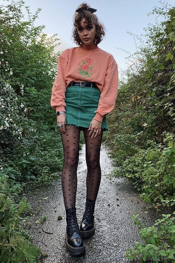 I like how this outfit blends softer colors with darker elements. A sweatshirt and mini skirt combo feels easy to wear, while tights and platform boots add that edge, creating a look that feels both playful and slightly moody.