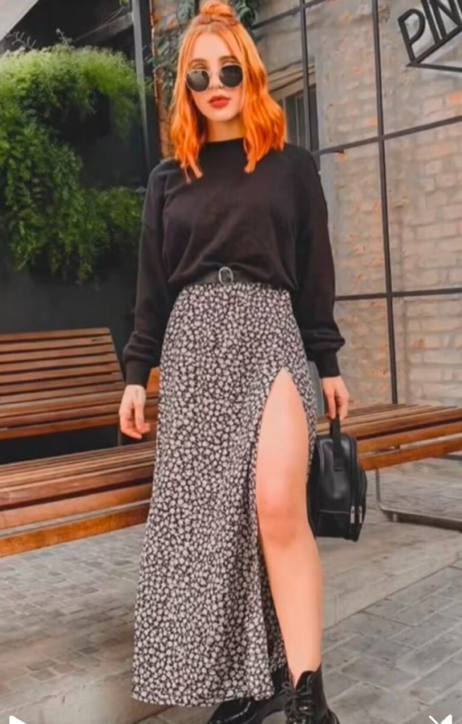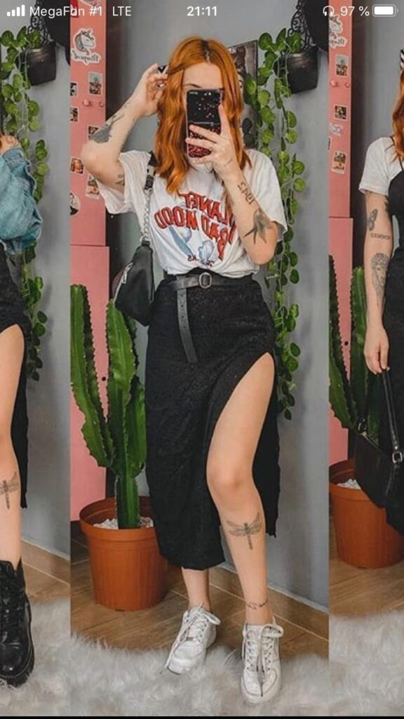 I like how an oversized graphic tee instantly becomes the focus when paired with a high-waisted black midi skirt with a slit. It gives just enough edge while still feeling balanced. Adding simple sneakers and a belt pulls everything together without making the outfit feel complicated.