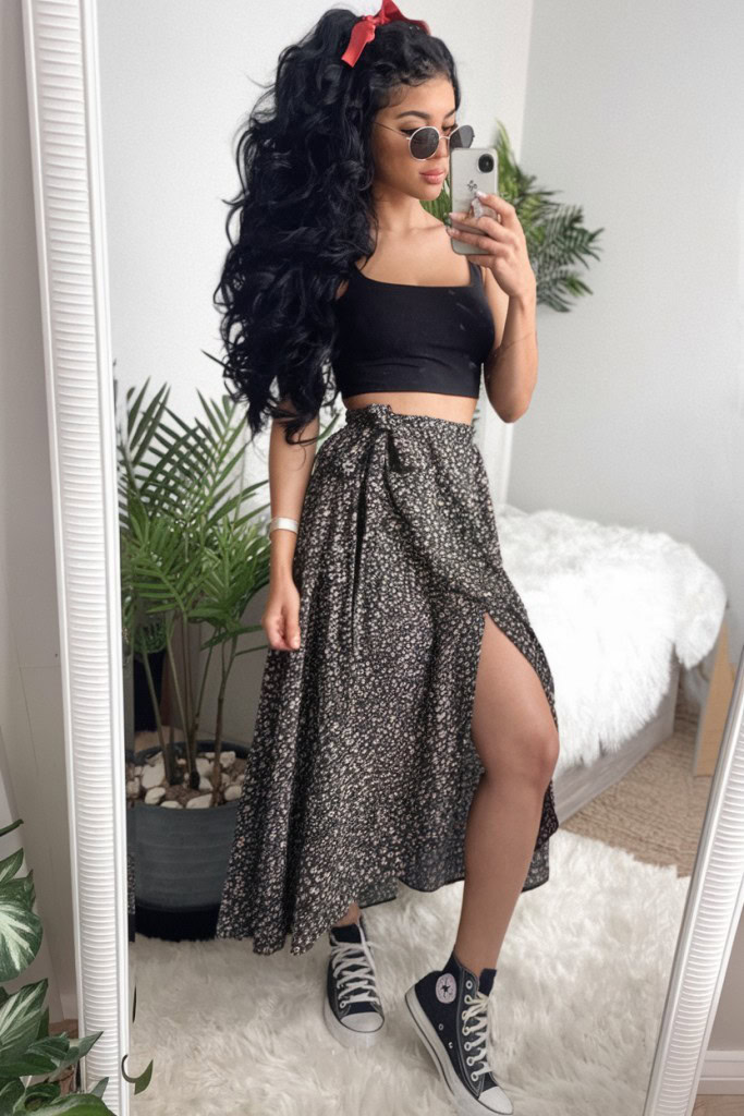 This look feels perfect when I want something simple but still eye-catching. A fitted crop top with a flowy floral skirt creates a mix of soft and bold, and adding sneakers and small accessories gives it that nostalgic Y2K feel without trying too hard.