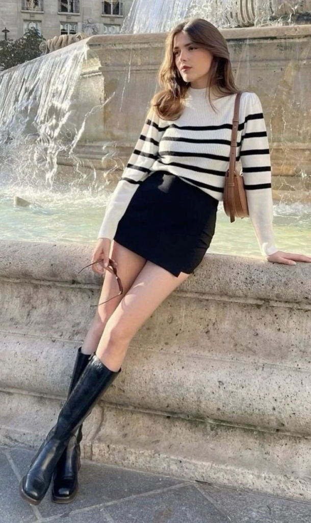 A striped sweater styled with a black mini skirt creates a timeless foundation. Knee-high boots sharpen the look and add confidence. A structured bag finishes the outfit cleanly. It’s proof that simple pieces can look strong when styled with intention.