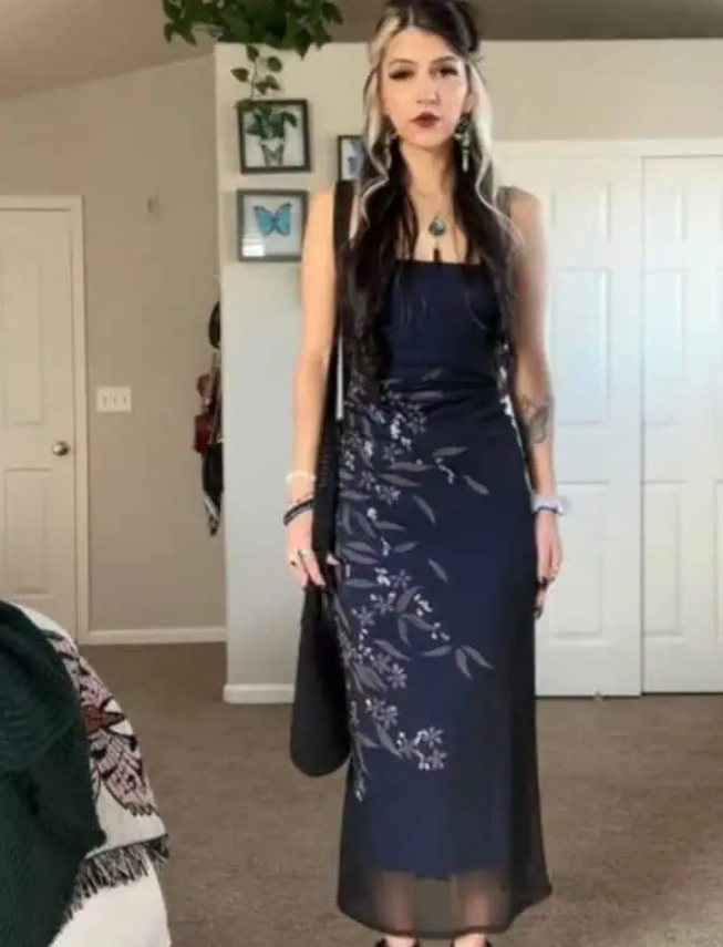 A floral slip dress styled with an oversized blazer transforms something delicate into something more confident. Combat boots add attitude and contrast. The layers give dimension and keep the outfit from feeling too simple. It’s a thoughtful blend of feminine and edgy.