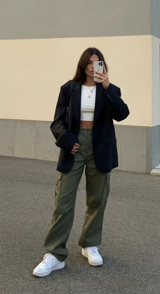 An oversized blazer balances the casual feel of cargo pants, creating a structured yet relaxed outfit. Simple inner layers and sneakers keep the look comfortable and suitable for everyday campus routines.
