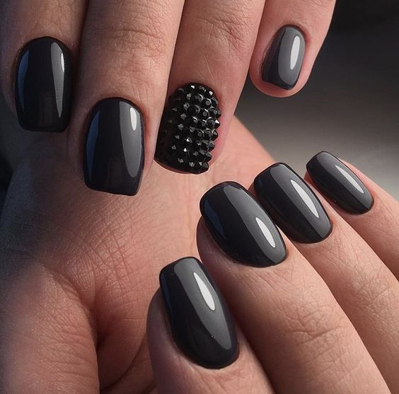 Rhinestones on black nails elevate the look with a jewelry-like sparkle, ideal for adding a luxurious touch.