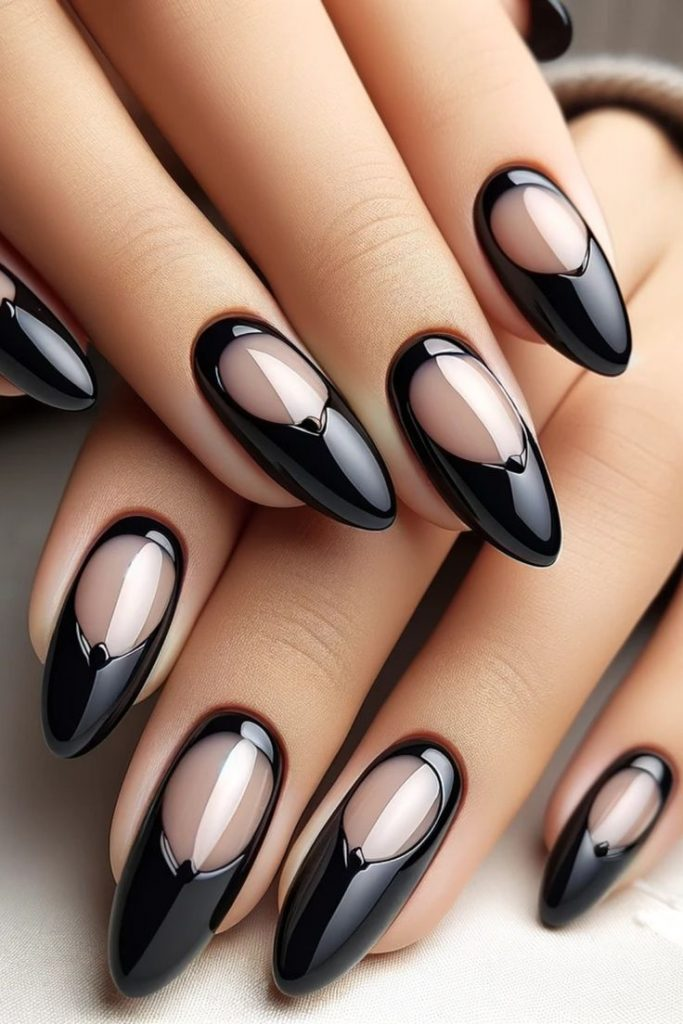 Almond-shaped black nails are refined and stylish, giving a sophisticated edge to any manicure.