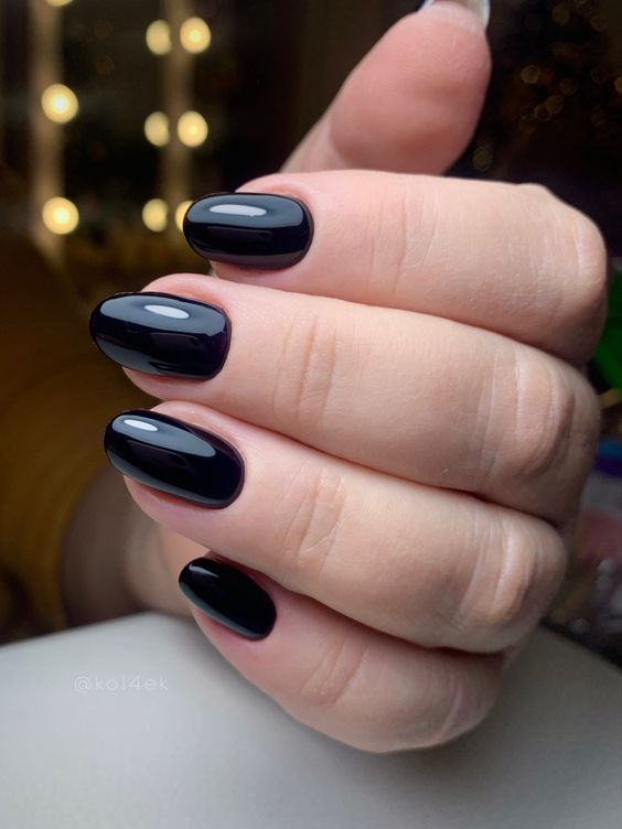 Oval-shaped black nails are classic and elegant, flattering for a variety of hand shapes.