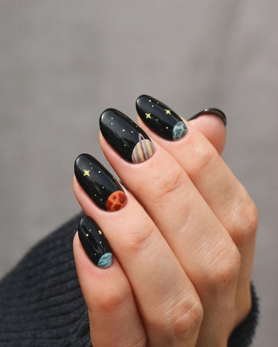 Space-inspired black nails with stars and planets create a playful, creative look that stands out.