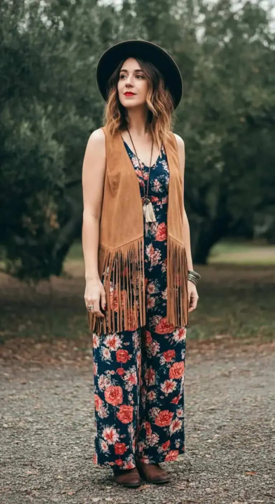 This look features a flowing printed jumpsuit layered with a fringed vest that adds movement. Statement jewelry builds depth, while platform sandals and a macramé bag complete the expressive bohemian outfit.