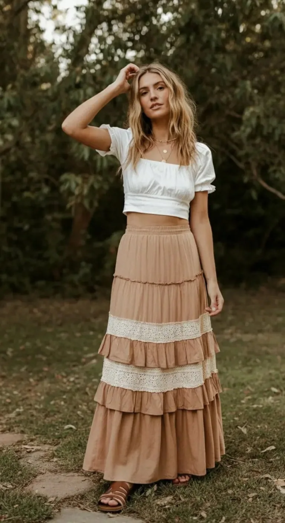 A simple crop top balances a tiered maxi skirt in warm, earthy tones. A wide leather belt defines the waist, while minimal sandals and shell-inspired jewelry keep the look natural and easy.