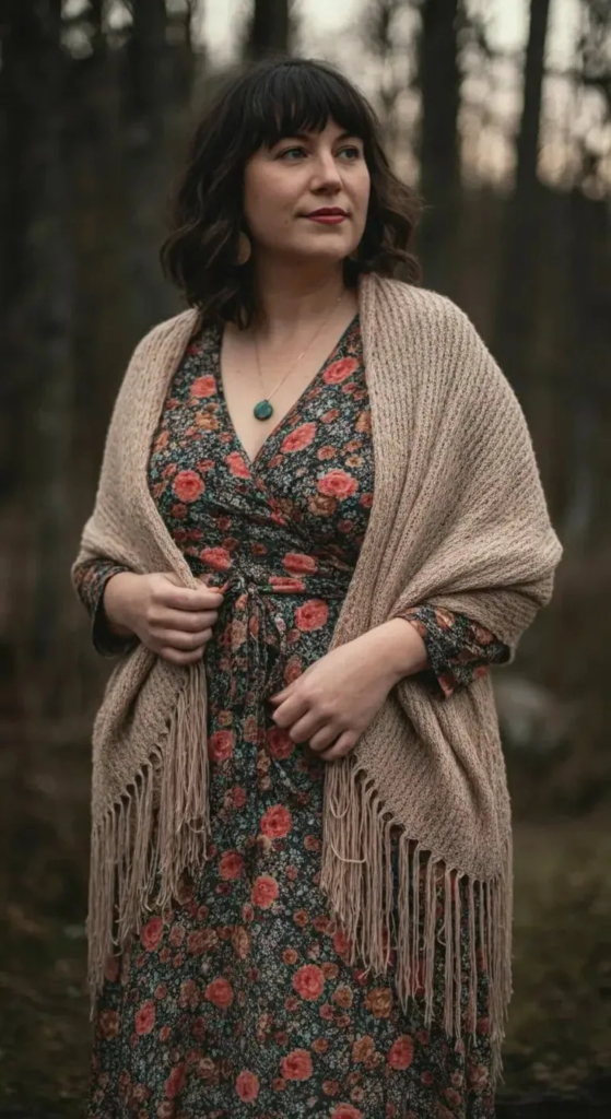 This look features a printed wrap dress layered with a fringed shawl for texture and movement. Turquoise accessories stand out, while western-inspired ankle boots ground the outfit.