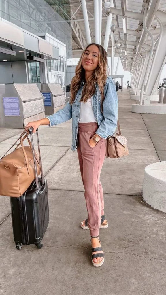 A light-wash denim jacket over a white tee with dusty rose joggers creates a stylish, casual airport look. A cognac crossbody bag adds warmth, and slip-on sandals make TSA transitions effortless. The outfit balances comfort, polish, and casual style for long days of travel.