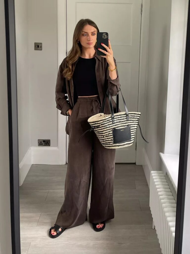 A relaxed brown button-up jacket paired with wide-leg trousers and a black crop top forms a coordinated, polished airport outfit. Chunky slides maintain comfort, while a cream and black woven tote adds visual interest. The neutral palette keeps the look stylish and wrinkle-free after flights.