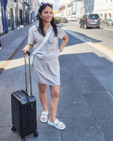 An oversized button-up worn as a shirt dress creates an effortless, intentional airport outfit. Paired with white slides and simple sunglasses, it reads polished and practical. The neutral palette and flexible silhouette allow layering or tying at the waist for versatile travel styling.