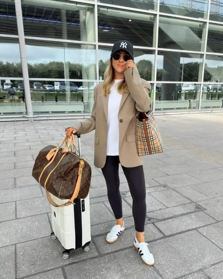 A beige oversized blazer with black leggings and white sneakers strikes a relaxed yet polished airport look. Accessories like a plaid bag and baseball cap add a sporty edge, while sunglasses and a structured carry-on elevate the outfit. It balances style and ease perfectly for terminal travel.