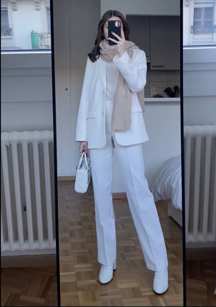 A tailored white suit with beige accents delivers a clean, confident silhouette. White boots and a quilted bag elevate the look, showing that simple, well-fitted pieces convey professionalism.