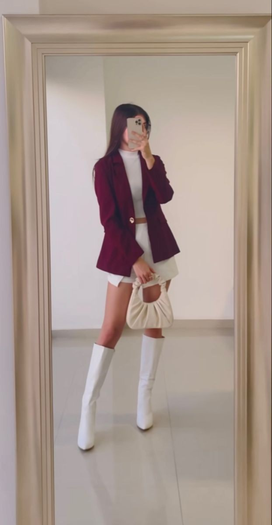 A burgundy blazer over a white crop top and cream shorts balances structure with modern flair. White boots and a cream bag make the outfit polished, proving bold colors can be professional and stylish.