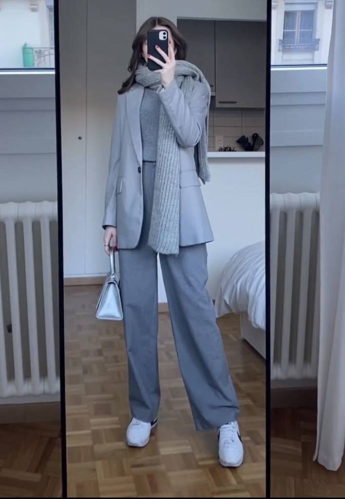 Layering a light blue blazer over a gray knit with wide-leg pants creates a cohesive, understated look. Accessories like a chunky scarf and white sneakers add a contemporary touch while keeping it professional.