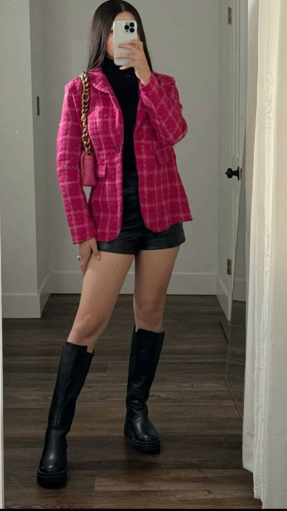 A bright magenta blazer over a black turtleneck and shorts energizes the look. Platform boots and a chain-strap bag combine style and polish, perfect for creative or casual office settings.