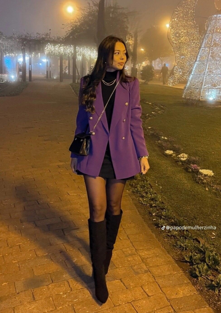 A purple double-breasted blazer paired with a black turtleneck and knee-high boots creates a versatile, statement outfit. A chain-strap bag adds modernity while keeping it workplace-appropriate.