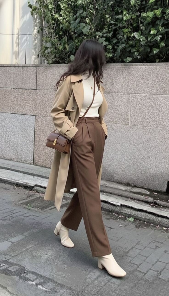 Layering a cream knit top with a camel trench coat and brown trousers creates a cohesive, professional outfit. Structured accessories and boots refine the ensemble, making neutrals feel modern.