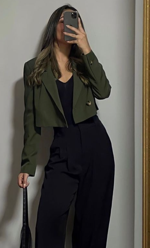 An olive blazer paired with black wide-leg pants creates a sleek, comfortable outfit. Layered with a black top, it transitions seamlessly from office meetings to social events.