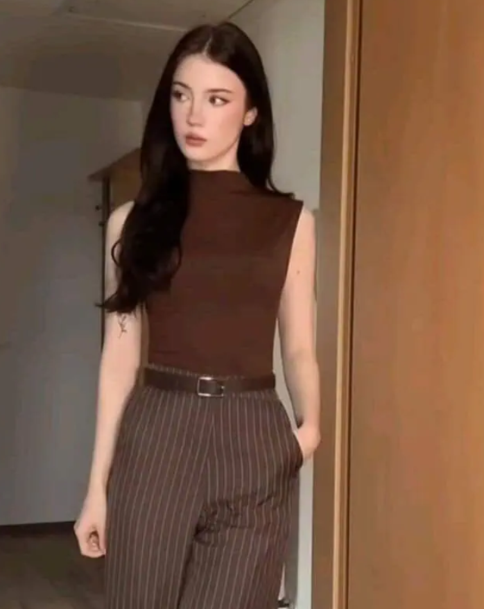 This look highlights minimalism and structure. The vest creates a clean upper silhouette, while pinstriped trousers add refinement. The belt defines shape without overpowering the outfit. Neutral tones keep it versatile. The styling feels confident and composed.